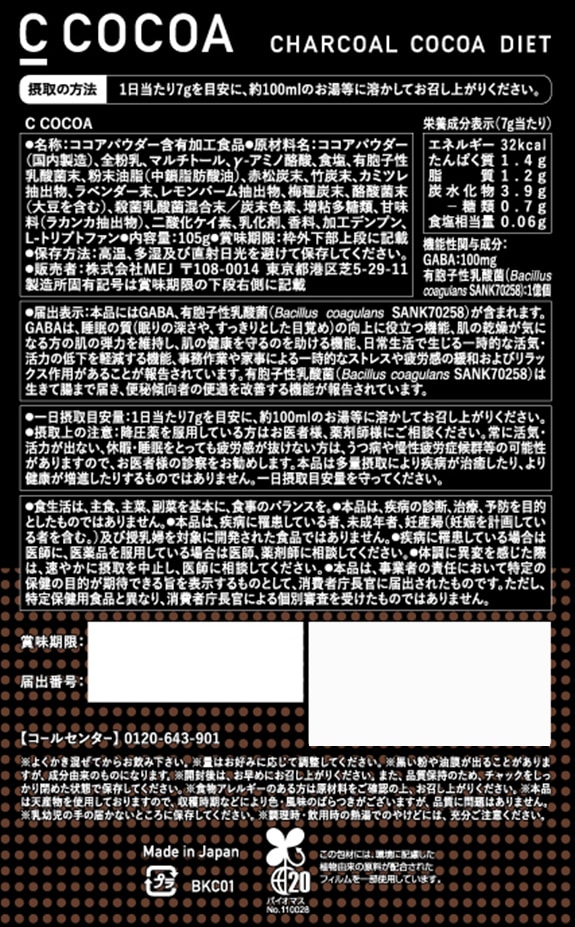 C COFFEE同様に国産炭やMCTオイルなどの成分に加えて、”睡眠の質”向上や一時的なストレスの緩和が期待される機能性関与成分「GABA」を配合したチャコールココア。