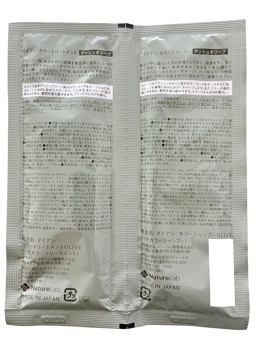 [10個]ネイチャーラボ ダイアン カラーシャンプー&トリートメント アッシュオリーブ トライアル | 次のカラーリングに影響が出ないよう配慮したノンシリコンタイプ