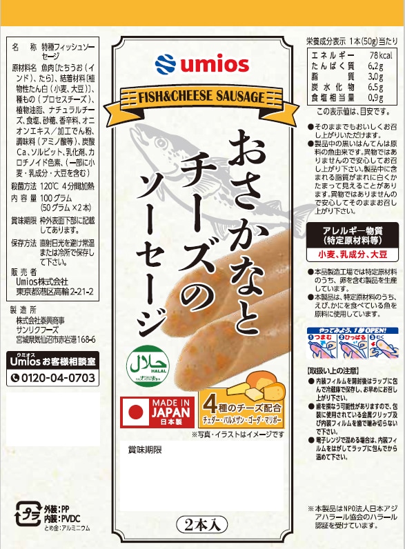[計120本]Umios おさかなとチーズのソーセージ 50g×2本入 | 4種のチーズを配合したフィッシュソーセージです。