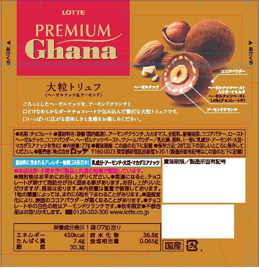 - ・プレミアムガーナ大粒トリュフ〈ヘーゼルナッツ&アーモンド〉 77g×10個