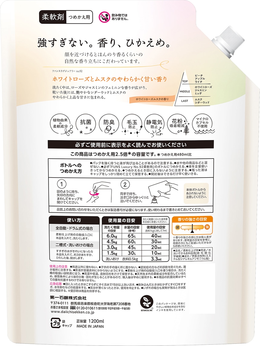 [8個]第一石鹸 FUNSラグジュアリー 柔軟剤 No.92 大型詰替用 1200ml | 植物由来の柔軟成分配合、抗菌効果で生乾き臭を防ぐ。ホワイトローズムスクの香り