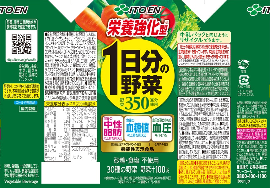 食後の「中性脂肪」・「血糖値」の上昇を抑え、高めの「血圧」を下げるトリプルヘルスクレームの機能性表示食品の野菜汁100%飲料です。