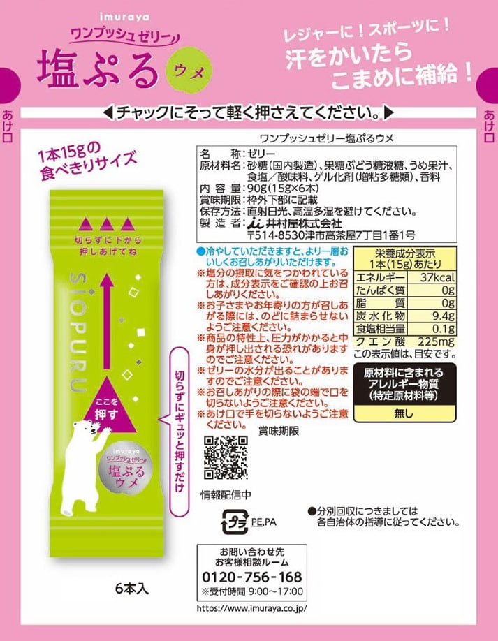 クエン酸と塩分が補給できるウメ味のゼリーです。原料には国産ウメ果汁ミネラル分の多い塩「ぬちまーす」を使用しています。こまめに食べられる15gの食べきりサイズ。みんなでシェアしやすい6本入です。常温保管できるため買い置き菓子にも適しています。冷やしてもおいしくお召しあがりいただけます。商品中央部を押すだけで中身のゼリーが出てくるのではさみや包丁を準備する事なくお召し上がりいただけます。
