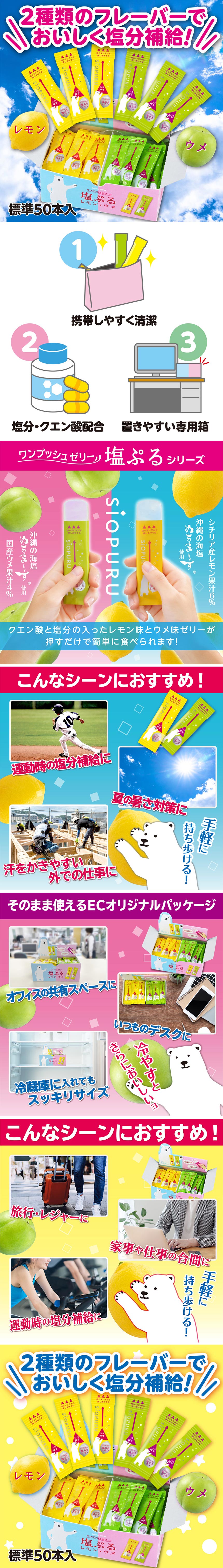 クエン酸と塩分が補給できるレモン味ウメ味のゼリーのアソートBOXです。商品中央部を押すだけで中身のゼリーが出てくるのではさみや包丁を準備する事なく簡単衛生的にお召し上がりいただけます。シチリア産レモン果汁国産ウメ果汁ミネラル分の多い塩「ぬちまーす」を使用しています。こまめに食べられる15gの食べきりサイズです。EC限定の大容量ボックスタイプで標準50本入りです。いつものおやつに仕事や家事の合間にもおすすめです。