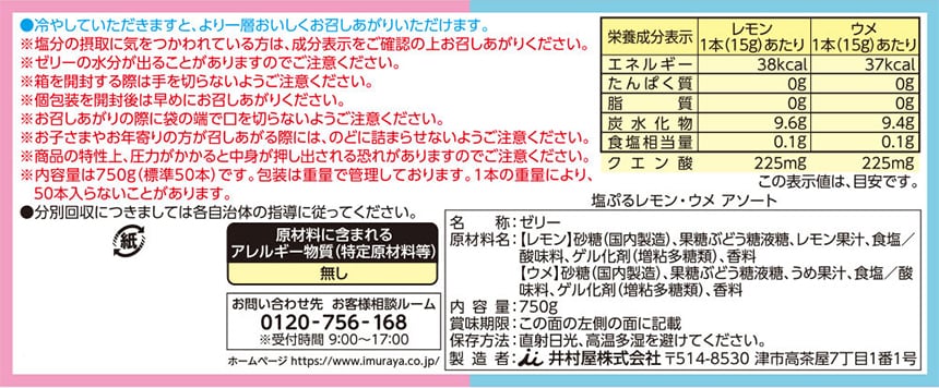- 井村屋 塩ぷるレモン・ウメ アソート 750g(50本入)×12箱
