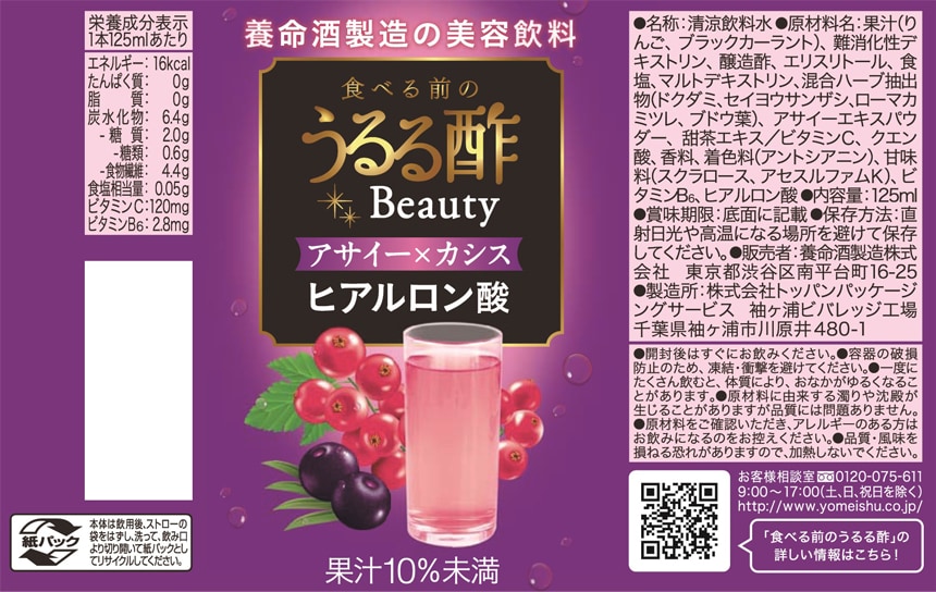 [72本]養命酒製造 食べる前のうるる酢ビューティー アサイー×カシス味 125ml | 飲みやすい「アサイー×カシス味」で低カロリーな美容サポートドリンク。