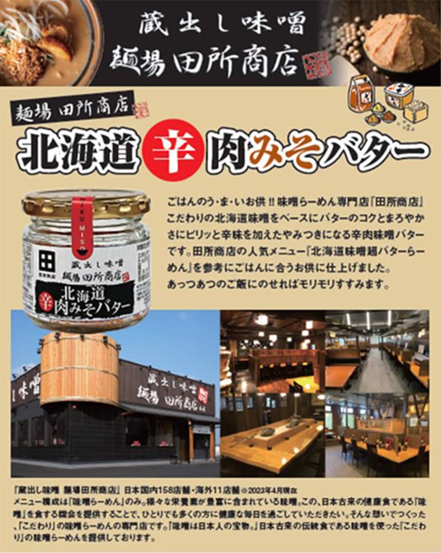 味噌らーめん専門店「田所商店」こだわりの 北海道辛肉みそをベースに、バターのコクとまろやかさにピリッと辛味を加えています。