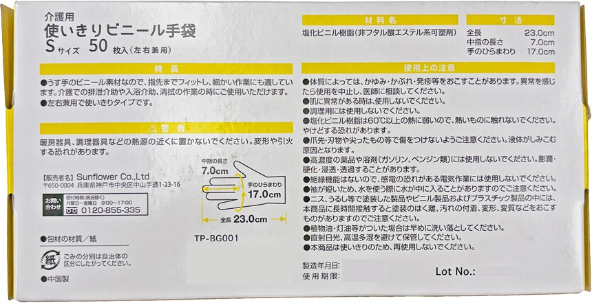 [計2000枚]向日葵 介護用 使い切りビニール手袋 Sサイズ 50枚入×40個 | 介護や清拭の作業時に!