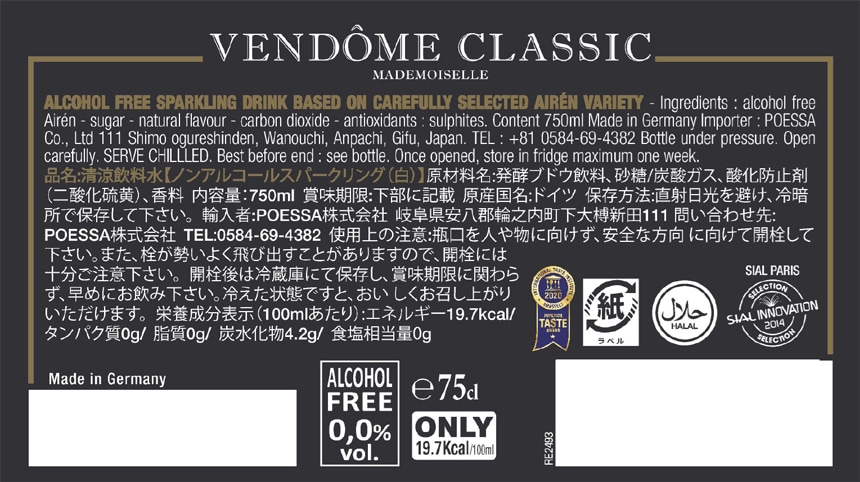 [12本]POESSA ヴァンドーム クラシック 750ml ※ラベル不良あり | 完成したワインから造られた、『本格的』ノンアルコールスパークリングワイン