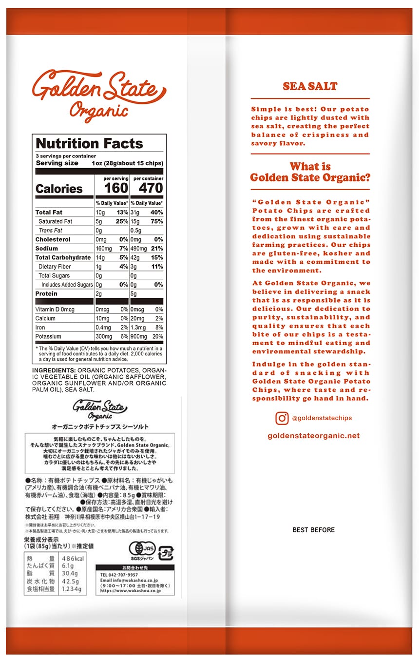 [15個]若翔 ゴールデン ステイト オーガニック 有機ポテトチップス シーソルト味 85g | 「気軽に楽しむものこそ、ちゃんとしたものを」をコンセプトに開発したスナックブランドです。