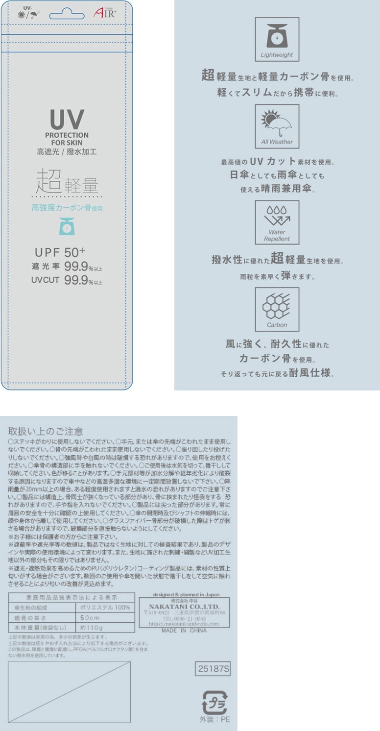 撥水性に優れた超軽量生地を使用。雨粒を素早く弾きます。風に強く、耐久性に優れたカーボン骨を使用。反り返っても元に戻る台耐風使用。