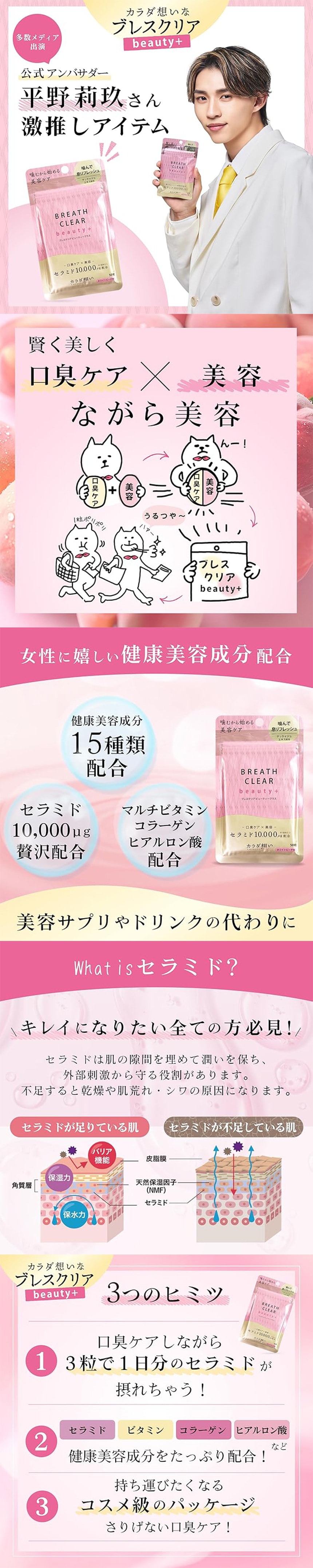 口臭ケアをしながら3種の美容成分がとれちゃうラッキーなアイテム。日常生活では不足しがちな美容成分を口臭ケアしながらお手軽に摂取。1粒で肌に潤いをもたらすセラミド10000μg配合 × ゲッケイジュ成分配合の本格ブレスケアタブレット