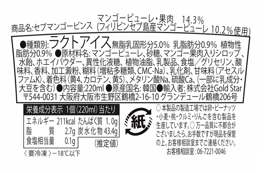 [15個]Gold Star セブマンゴビンス 220ml | マンゴー果肉入りのミルクアイスにマンゴーピューレアイス二層の仕組みで食べてると味変していく