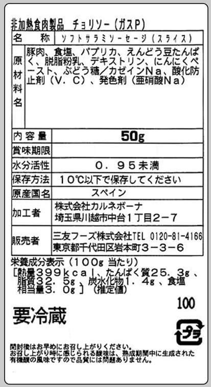 [10袋]三友フーズ スペイン チョリソー 50g | スペイン産サラミです。赤い色はパプリカ由来ですので辛みはなく、マイルドな口当たりです。