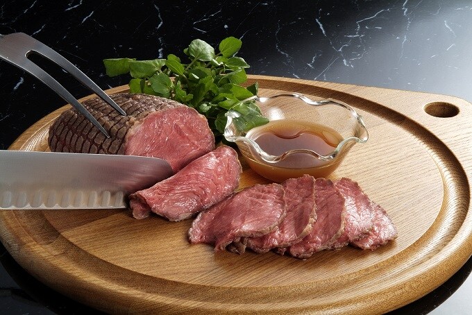 希少な北海道産牛リブロースを使用した「ローストビーフ」は、北海道羅臼の海洋深層水塩のみで味付けし、その他一切の添加物を使用していません。職人が分厚い鉄板上で焼き上げた絶妙なミディアムレアはたまりません!