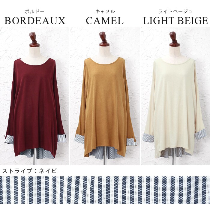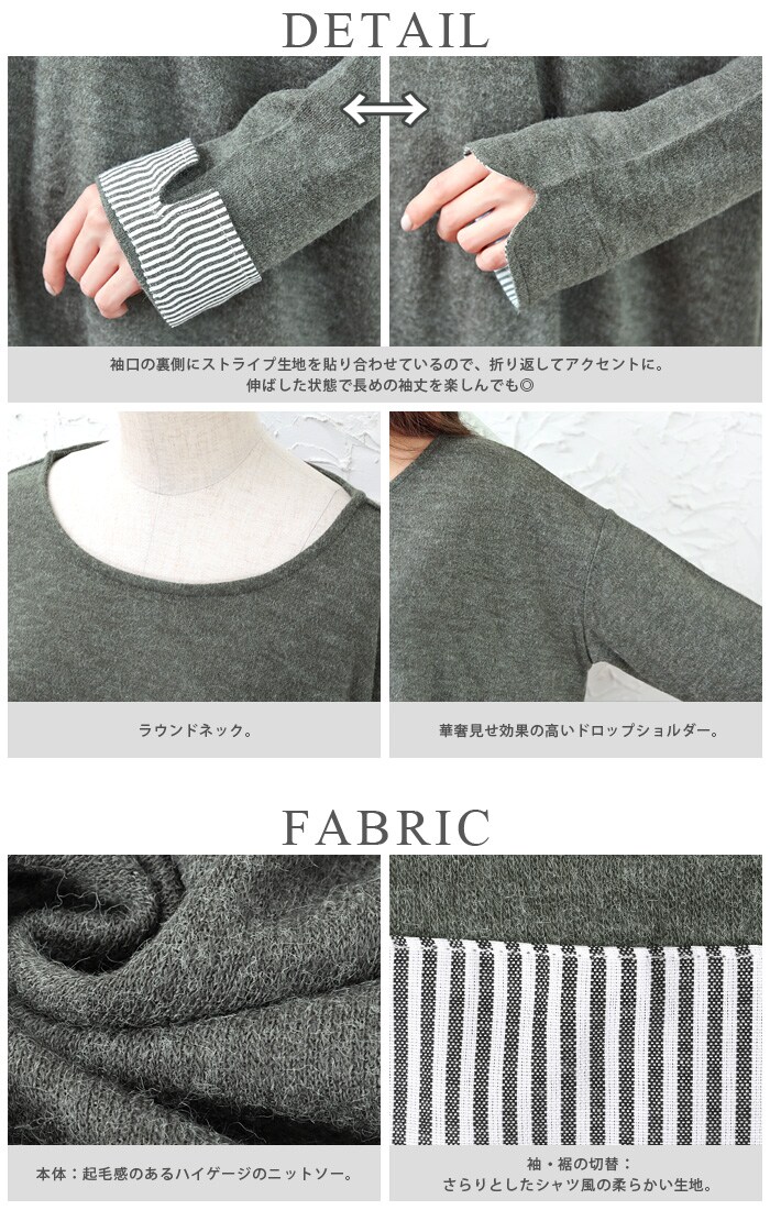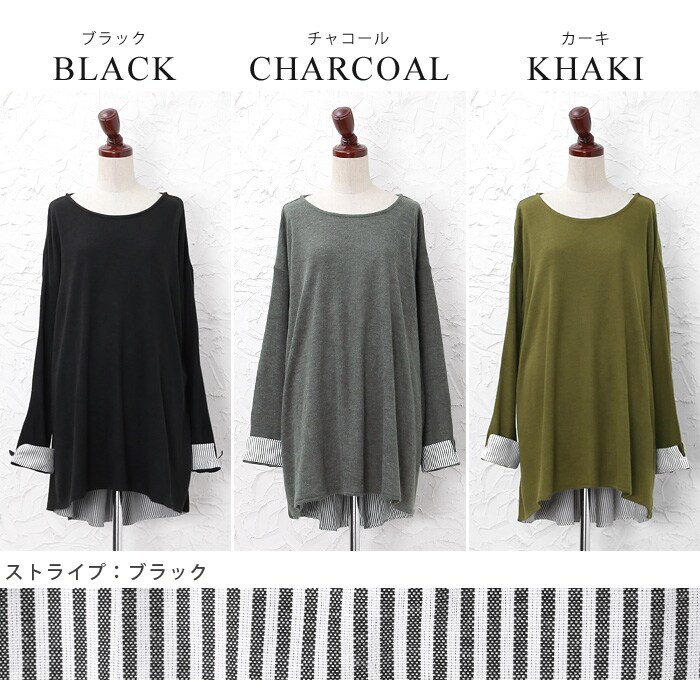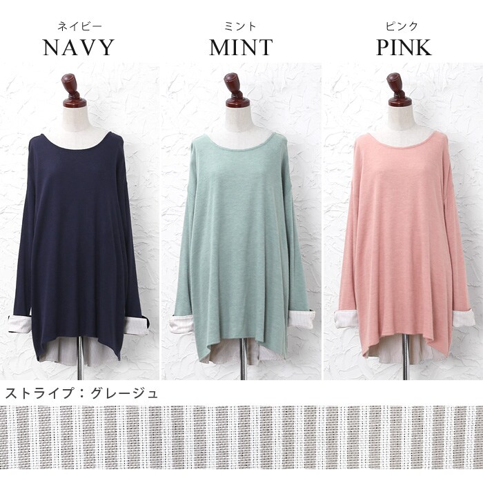 気負わずオシャレが楽しめる。異素材切替えニットソー | ニットソー トップス レディース ストライプ チュニック丈 シャツ 重ね着 テールカット