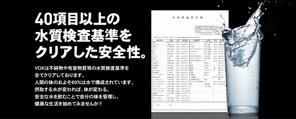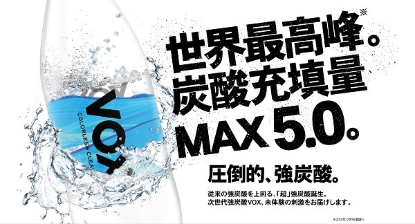 99.99%の純度を誇る二酸化炭素を特許技術「マイクロバブル圧縮充填法」により世界TOPレベルの炭酸充填量5.0を実現。炭酸水の新たなスタンダード「VOX」。