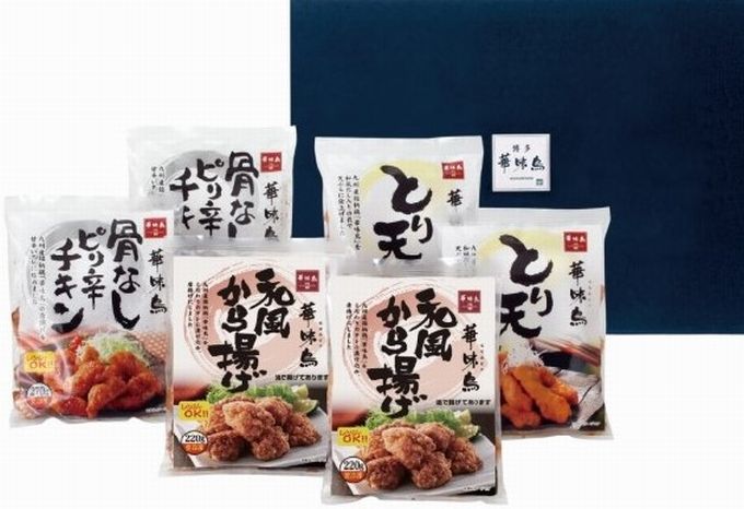 自社で養鶏場を持ち、丹精込めて育てたブランド鶏 九州産銘柄鶏華味鳥。福岡の水たき料亭でも使用している鶏肉で、舌のこえたお客様からもご支持いただいているの銘柄鶏です。その銘柄鶏華味鳥を使用した、骨なしピリ辛チキン、とり天、和風唐揚げをセットにしました。華味鳥の良質な肉質は、独自のしっかりした歯ごたえを併せ持ち、更に鶏独特の臭みを抑えている為、充分に鶏の旨みを味わっていただけます。電子レンジで簡単に調理でき、夕飯のおかずやお弁当にもピッタリです。