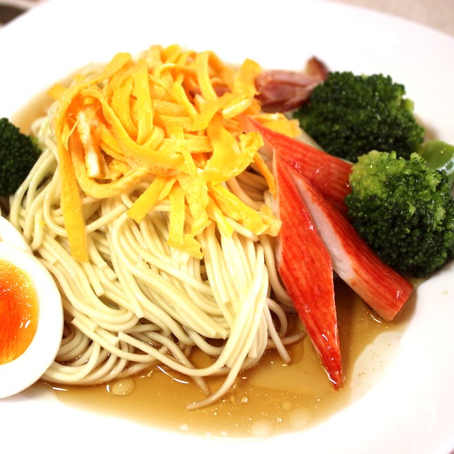 ・最後に、お好みの新鮮なお野菜や具材をトッピングして、専用スープをかければ冷し中華の完成です!