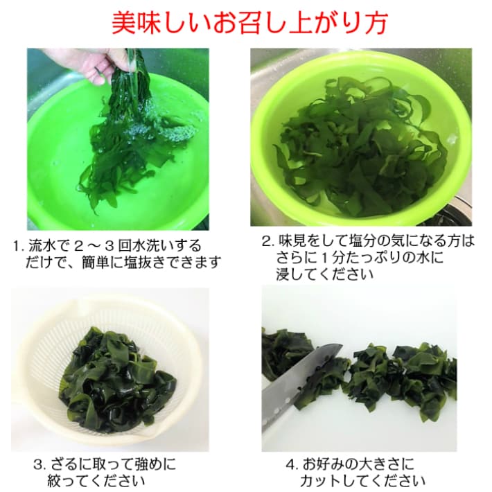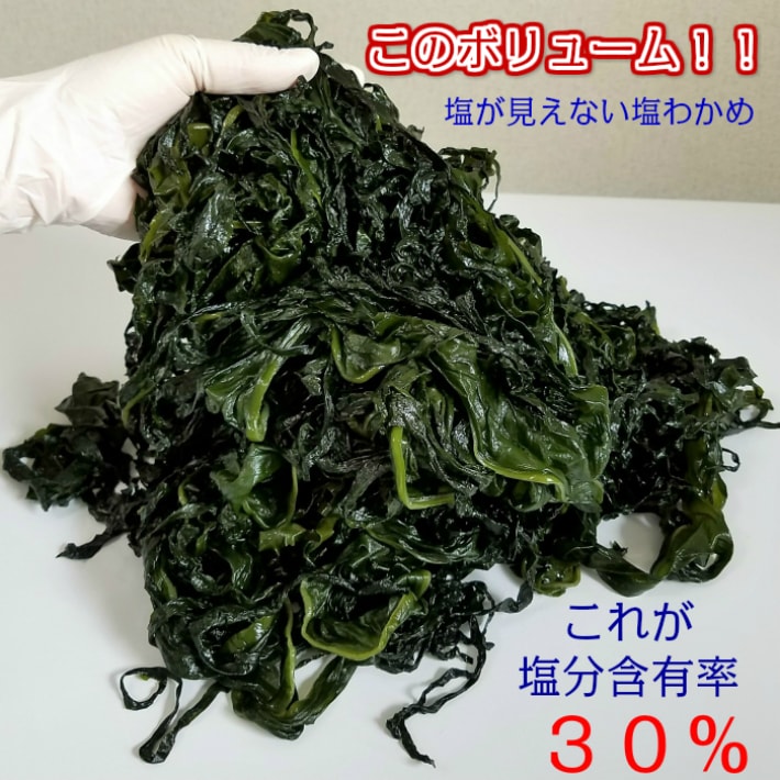 本品は 塩蔵わかめとして必要な塩分以上に余分な塩は加えていませんので、同じ重量のわかめと比べてみても わかめの量が多い事がお分かりいただけます。とても使いがいのあるお得なわかめで、しかも水戻しが簡単です。