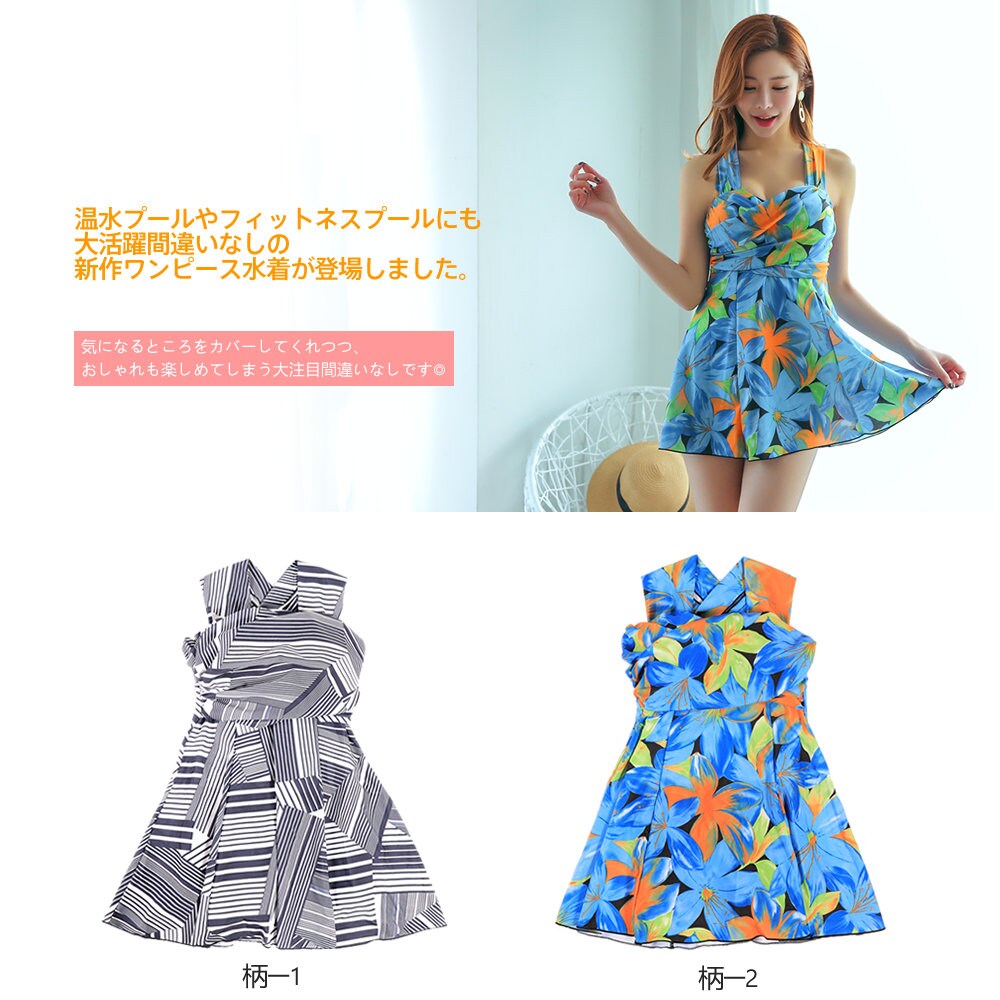 2018新作 おしゃれ 体型カバー 流行 ママ水着 花柄 レトロ ボーダー | 気になる部分はカバー!6カラー・ワンピース水着♪