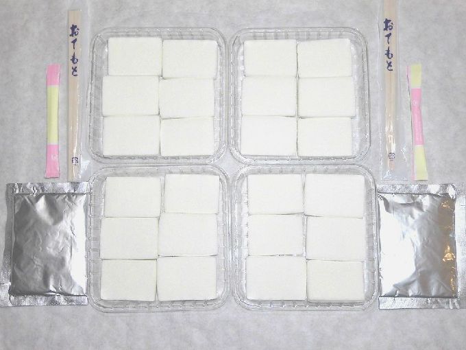- きなこ餅:(乾燥餅12枚(80g)+調整きなこ30g+砂糖3g)×2袋(トレー・お箸付き)