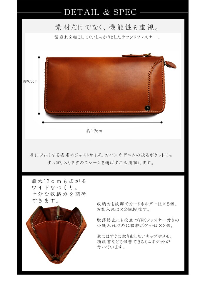 イギリスのキャプタル社の高級イタリアンレザーを使用した、人気のベジタブルレザー財布。1つ1つ職人により輝きを確認しながら染めていく手染め手法をを使用しています。本場イタリアで認められた植物タンニン鞣しレザー、本革でしか味わう事のできないエイジングの楽しみ、飽きの来ないシンプ ルかつスタイリッシュなデザイン、世界中に顧客を持つ本物のハイブランドの品を所有する喜びを是非あなたに。手にフィットする安定のジャストサイズ。人気の本革財布をお手ごろにお使い頂けます。カードポケットも多く、機能面を重視する方にもオススメです。 世界のYKKファスナーも使用され部品にも妥協を許さないこだわりぶり。