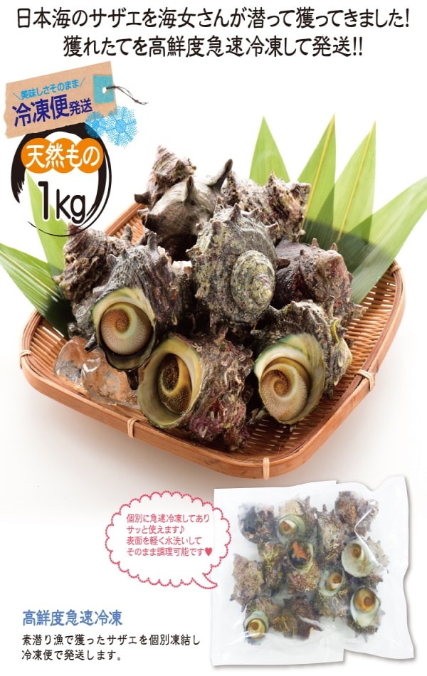 【1キロ】《冷凍便》日本海産さざえ 獲れたてサザエを高鮮度急速冷凍 | 海女さんが素潜り漁で獲った新鮮なサザエ個別凍結で扱いやすい