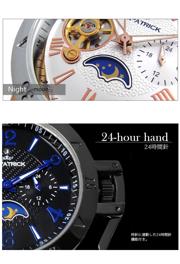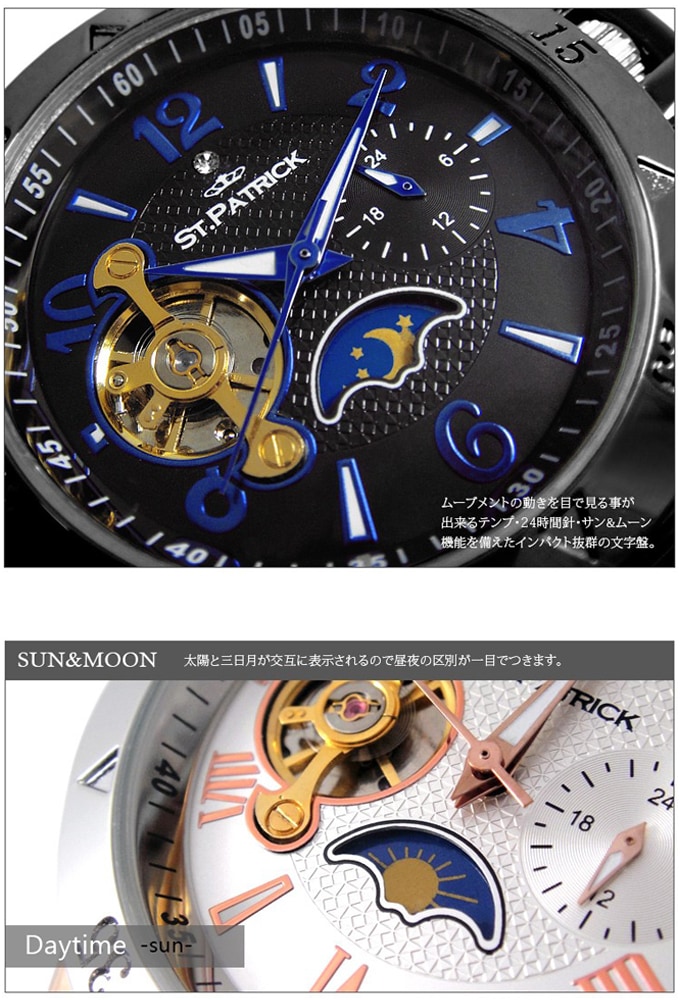 個性的なリューズカバーが目を引く自動巻き式腕時計。月と太陽交互に現れ午前と午後を知らせるサン&ムーン機能・24時間針・時計の心臓部となるテンプの動きを楽しめる飾り窓など、実用性にも優れたデザインに仕上がっています。裏面には世界にひとつだけのシリアルナンバー入り。