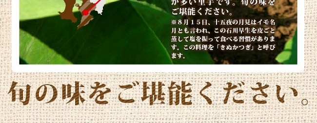 ※8月15日、十五夜の月見はイモ名月とも言われ、この石川早生を皮ごと蒸して塩を振って食べる習慣があります。この料理を「きぬかつぎ」と呼びます。