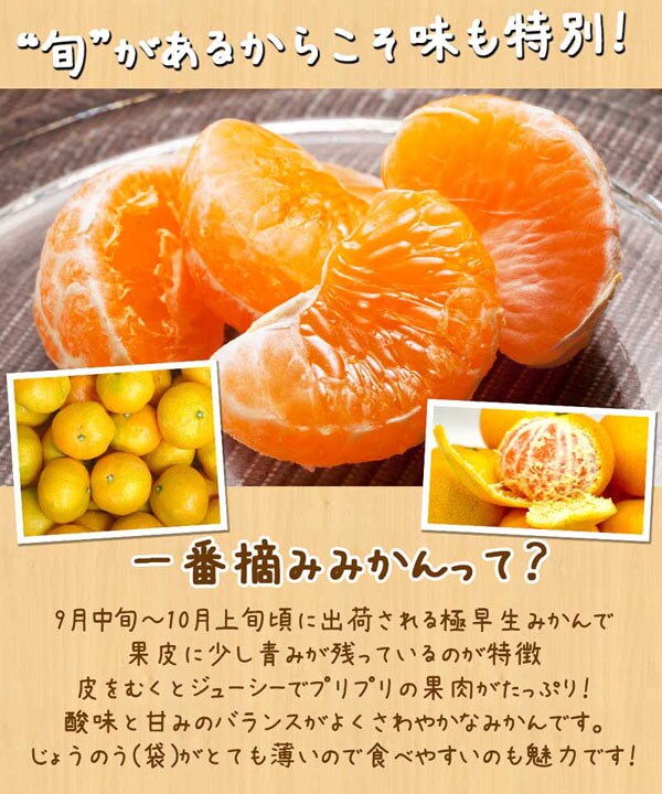 極早生みかんとは9月中旬から10月上旬頃に出荷される一番乗りみかんで果皮に少し青みが残っているのが特徴で皮をむくとジューシーでプリプリの果肉がたっぷり。