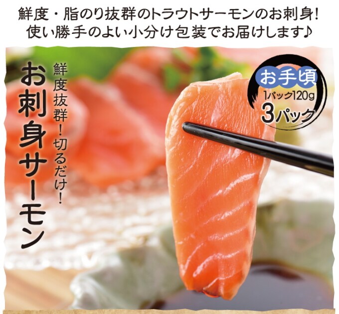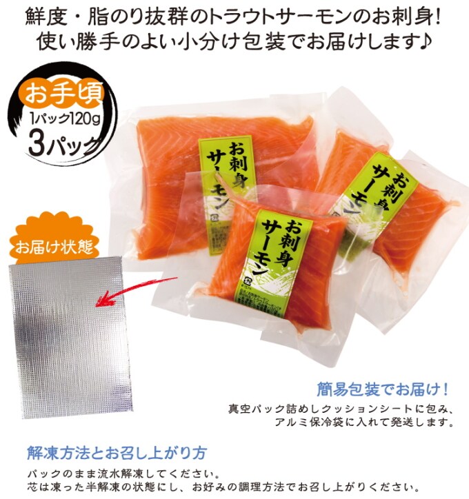 【小分け包装120g×3パック】《冷凍便》【BBQ】活き〆トラウトサーモンお刺身 | 活き〆&急速凍結で鮮度抜群脂のりがよくクセのない味いろんな料理に使えます