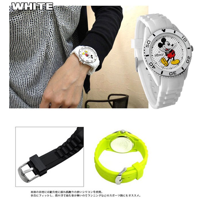 メタリックな文字盤の中央にはレトロなミッキーをデザイン。ミッキーは3D仕様でぷっくりぷにぷにキュートな仕上がりに♪本体とベルトには耐久性に優れ肌触りの良いシリコンを使用。手首にフィットし、雨や汗で痛む事が無いのでランニングなどのスポーツ時にもオススメ。