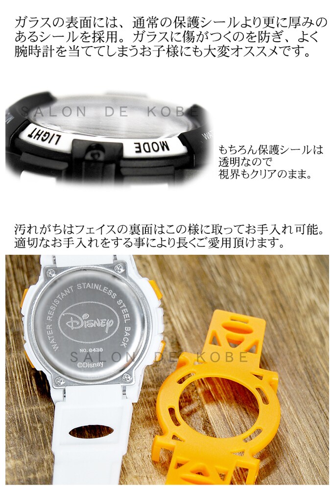 Disneyが持つ遊び心いっぱいの世界感と日常の生活に必要な機能が融合した自由でクリエイテブなデザイン。ベルトにはラバーを使っていますので頑丈で壊れにくい構造。フェイス周りのデザインは衝撃を吸収しやすくなっていますので動きが多いお子様にもオススメ。