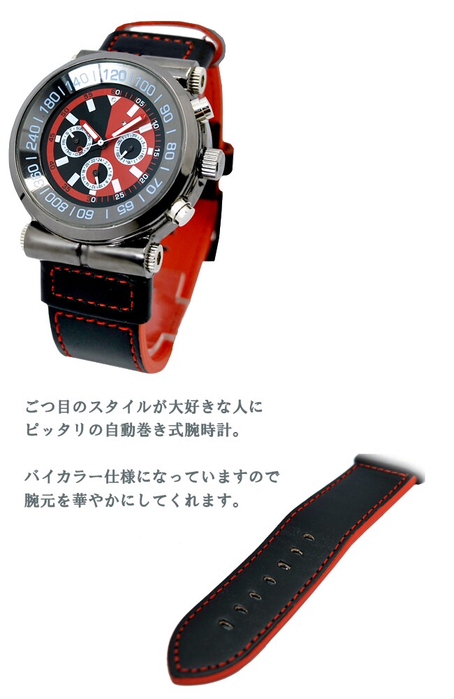美しい文字盤の自動巻き式腕時計。赤と黒のコントラストが美しく腕元を演出します。