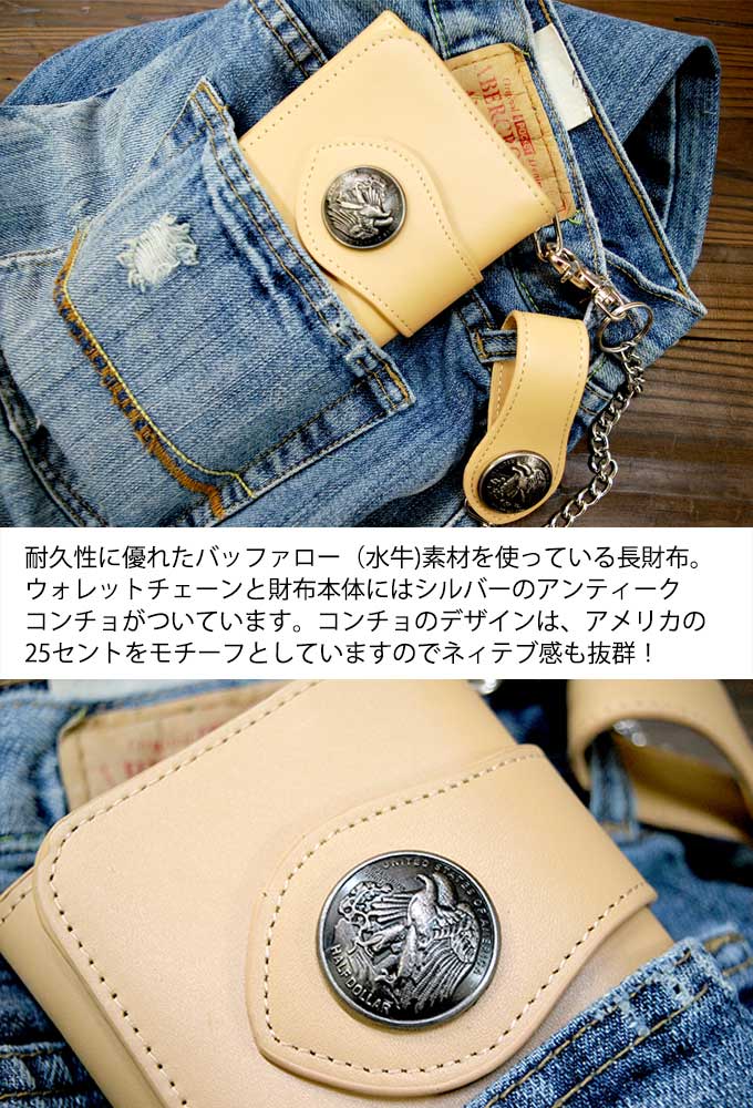 使えば使うほどに美しく表情を変化させる本革製品! 本水牛革&本牛革使用アメリカンコンチョ長財布 本水牛革の美しさを前面に出したシンプル・デザインが素敵です。 表面は滑らかでツヤのあるエナメルのよう。 さらにキャメルの色は素材そのものを使って生産しました。 ハードなシルバーカラーのチェーンをつけることでアクセントになり味が数段UP! 高級革製品の特徴として上げられる条件は使うほど味わい深くなると言うことです。 貴重性と美しさを秘めた本水牛革長財布。この財布もぜひ貴方色でご使用下さい!