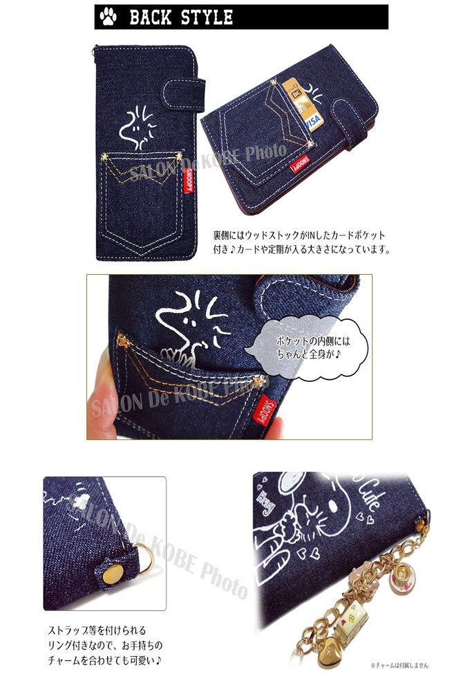 デニム生地でカジュアルに仕上げた、スヌーピーの全機種対応手帳型スマートフォンケース。