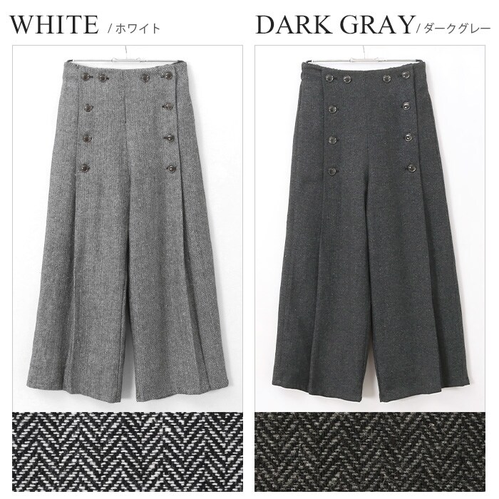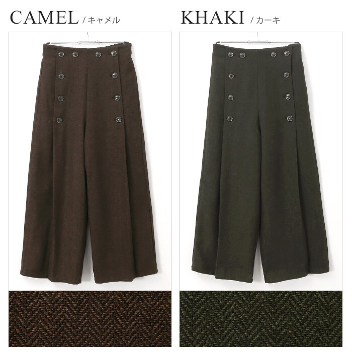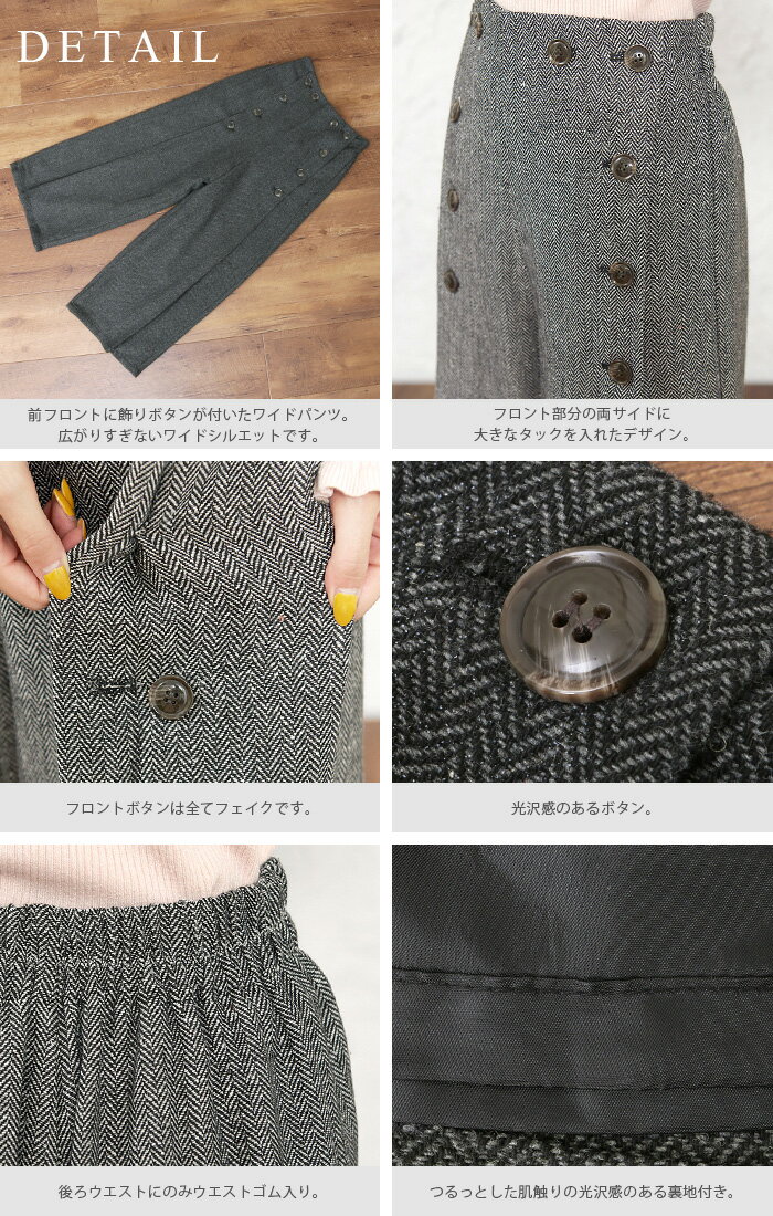 ボタンでウエストスッキリ!ヘリンボーン ボタン付ワイドパンツ | パンツ ワイドパンツ スカンツ ヘリンボーン レディース ボトムス ハイウエスト ボタン