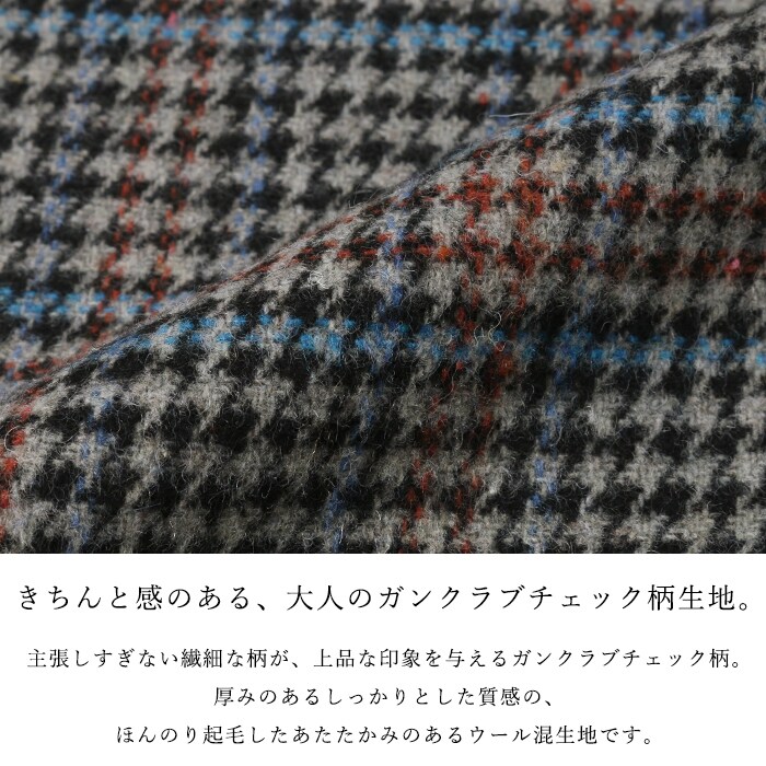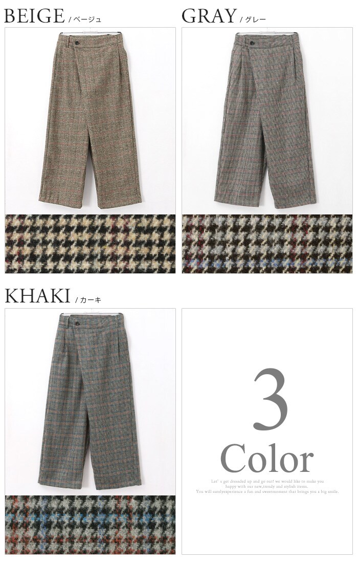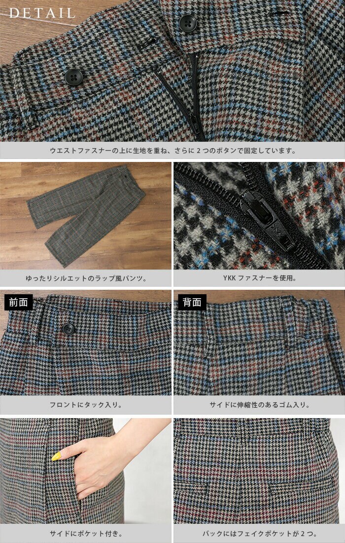 ウエスト周りがスッキリ見える程良い厚みのウール混ガンクラブ ラップパンツ | 起毛 パンツ ワイドパンツ ブリットチェック ガンクラブチェック レディース ボトムス