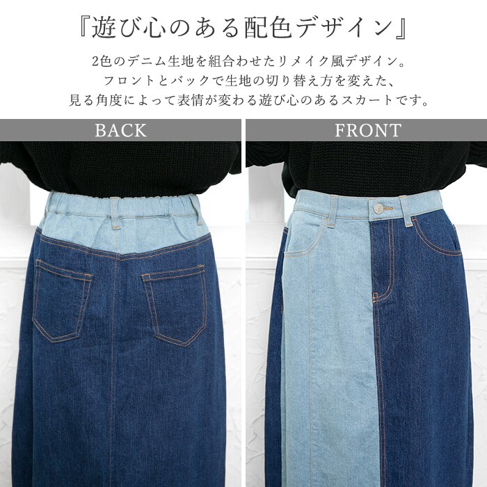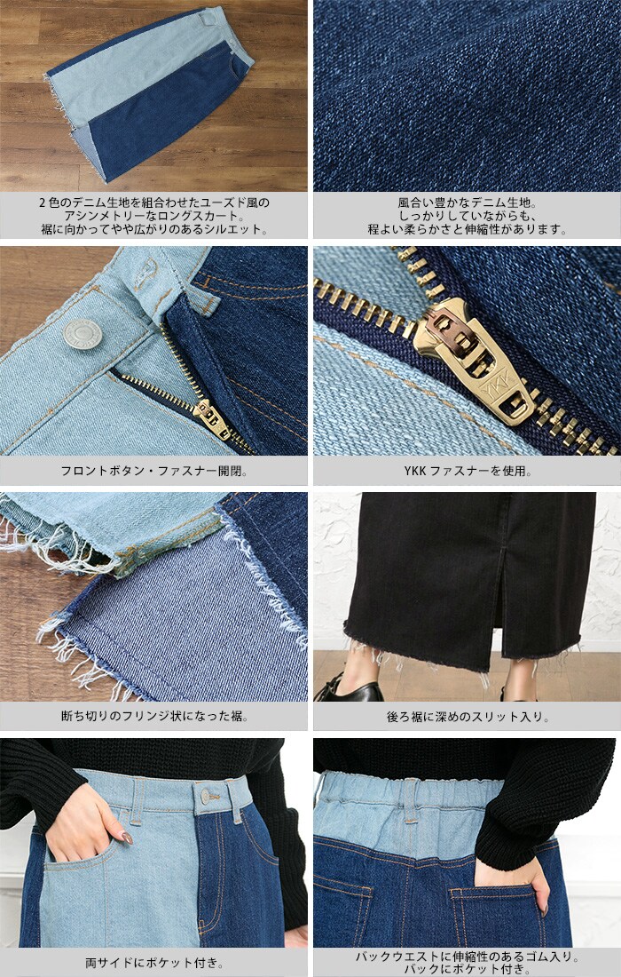 個性派カジュアルアイテム。デニム配色ロングスカート | スカート デニムスカート リメイクスカート 個性派スカート デニム 配色 レディース