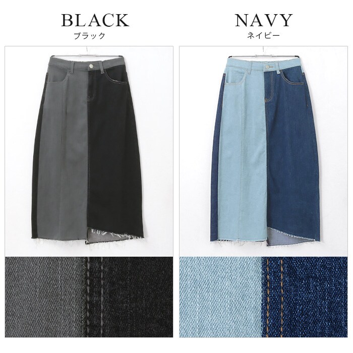 - 個性派カジュアルアイテム。デニム配色ロングスカート