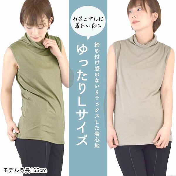 - ハイネックロング丈ノースリーブ タンクトップ カットソー アメリカンスリーブ 無地