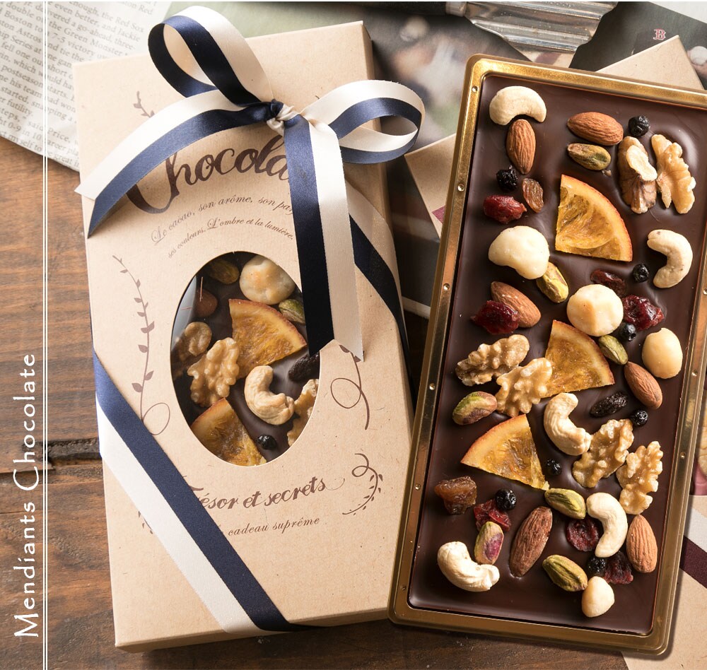 ・原材料/材質/素材:カカオマス、オレンジ、胡桃、カシューナッツ、マカダミアナッツ、アーモンド、クランベリー、レーズン、砂糖、ココアパウダー、ココアバター、乳化剤、香料(原材料の一部に大豆を含む)