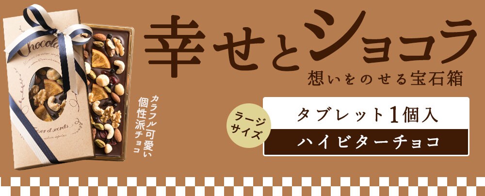 ・その他商品仕様:クーベルチュール使用。お礼や贈り物、プチギフトにもぴったりな可愛いチョコレート「幸せとショコラ」シリーズは、ドライフルーツやナッツがたくさん散りばめられた、まるで宝石箱のような魅惑のチョコレートです。コチラの商品はタブレット型のラージサイズが入った贅沢仕様。クーベルチュール使用のカカオ70%チョコレートはキリットほろ苦い大人の甘さ。舌の上でまろやかに溶ける、濃厚滑らかな味わいとナッツとドライフルーツの絶妙な組み合わせをお楽しみ下さい。