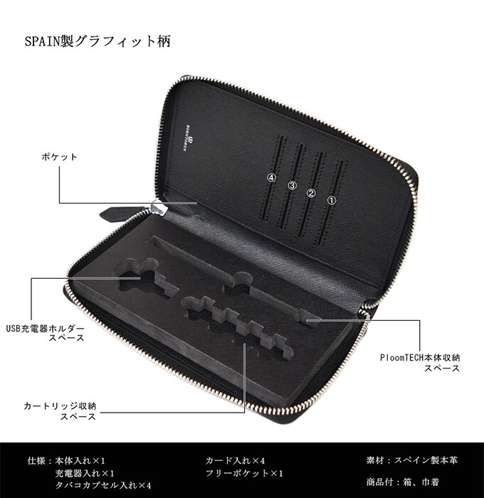 電子タバコは急速に普及し、今までタバコを吸わなかった方も電子タバコから吸い始めたなんて方もいらっしゃるかと存じます。しかし、皆様それを収納するケースは皆さまお持ちでしょうか?? 巷ではチープなケースはよくありますが、弊社は他者と差別化できる高級スペインレザーを使用したグラフィット柄プルームテックケースを作りました。