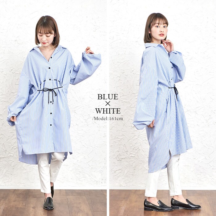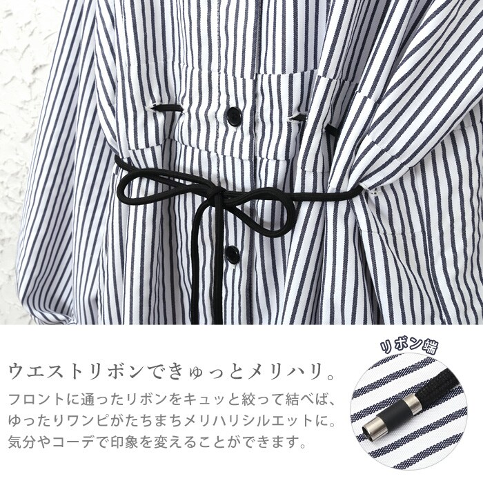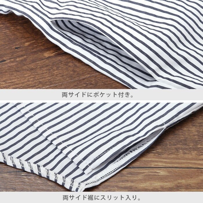 ワイドな袖にタックを入れて、ふっくらとした袖に仕上げました。フロントのウエストに紐を通し、前で結ぶと女性らしいメリハリが。ストライプ柄は爽やかで、縦のラインでスッキリ見えます。両サイドにはポケットを付け、裾にはスリット入り。少しハリのあるさらっとした生地で、程良いシルエットをキープ。他と差が出る、デザイン性の高いアイテムです。