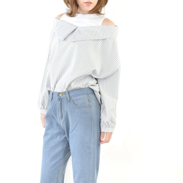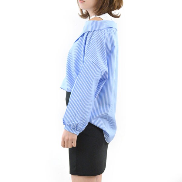 重ね着風ストライプ柄オフショルシャツTシャツ | オフショルシャツ&インナー一体型レイヤード風トップス★
