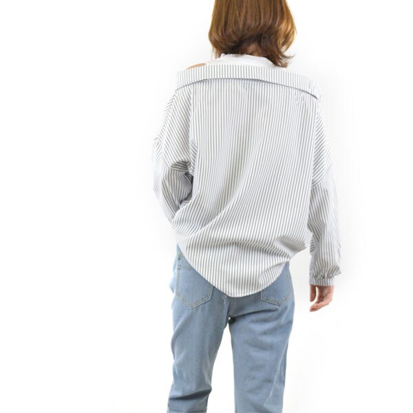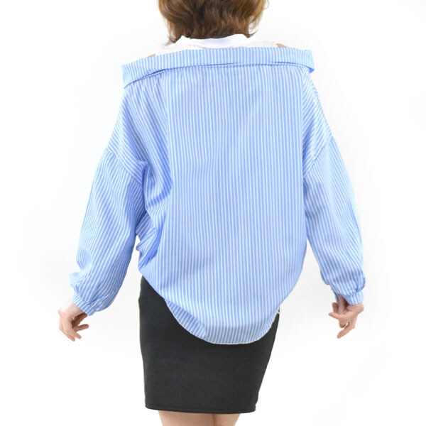 - 重ね着風ストライプ柄オフショルシャツTシャツ