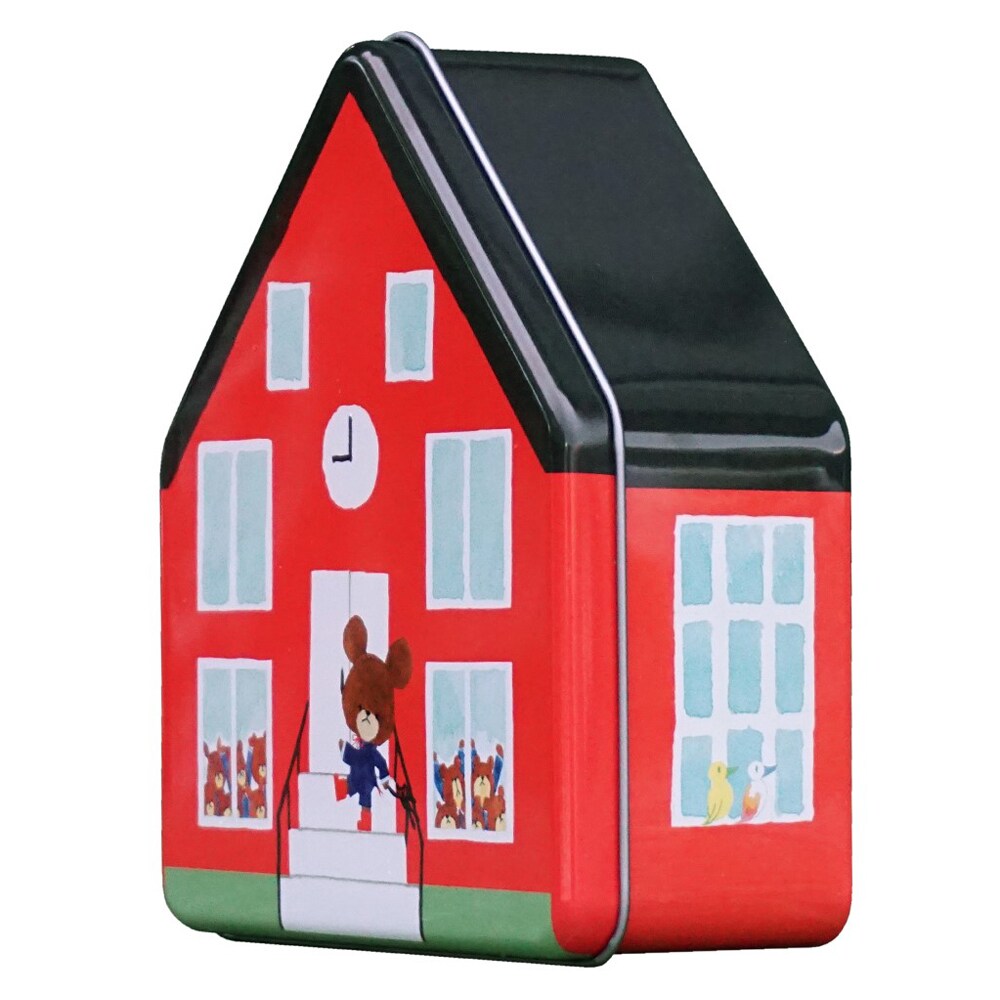 三角屋根付きの缶は、学校のデザインになっています。 フタを開けると、缶の内底にはジャッキーたちのかわいいイラストが描かれています。