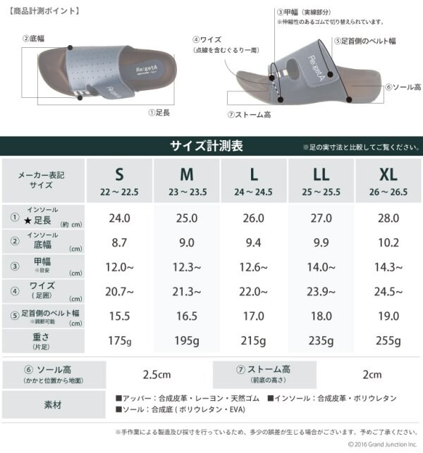 サイズ計測表の数値と、足の実寸法を比較してご確認下さい。
